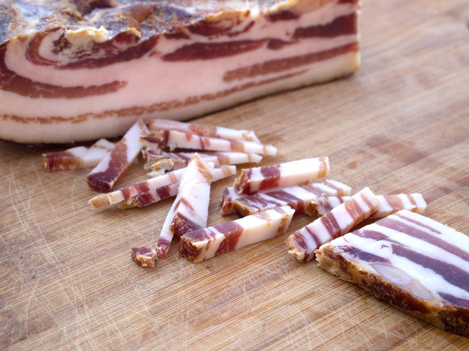 De guanciale heeft een rijk, intens aroma en een zachte, smeltende vetstructuur – onmisbaar in een échte pasta alla carbonara, gricia of amatriciana.